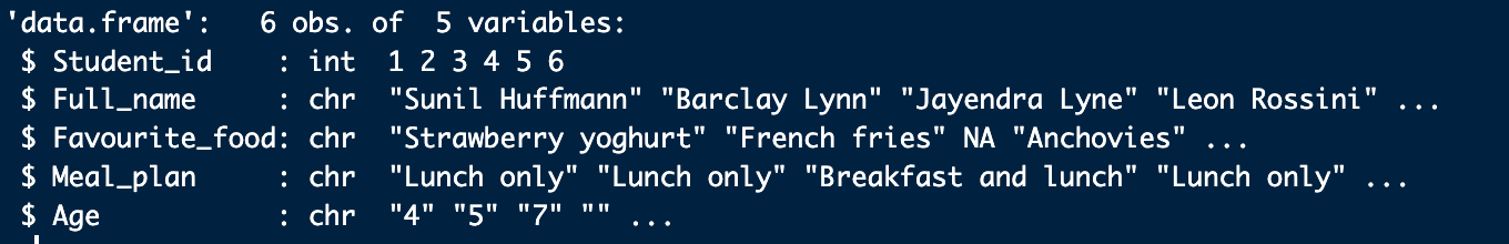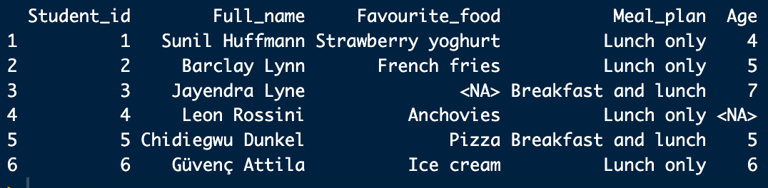 El nombre de las columnas debería tener un nombre consistente. Las dos palabaras que corresponden a la columnas: Student.ID, Full.Name y favourite.food están separadas por un . y mealPlan se diferencia por una mayúscula. Además todas están en minúsculas y AGE en mayúsculas. Para evitar futuros errores, los nombres deberán ser consistentes.