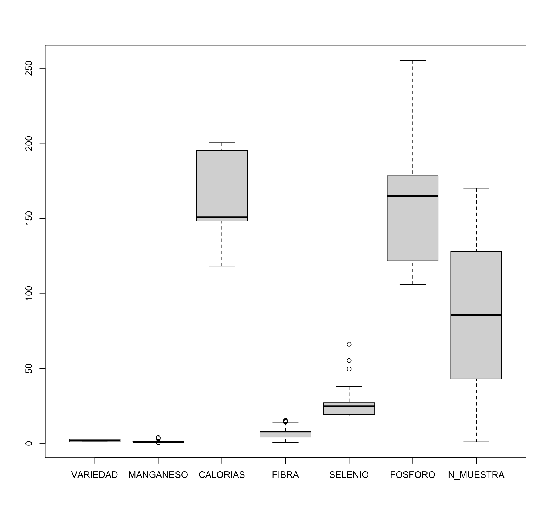 table(datos$VARIEDAD)Primero haría un boxplot de todas las variables numéricas para ver si efectivamente hay datos atípicos y como son: