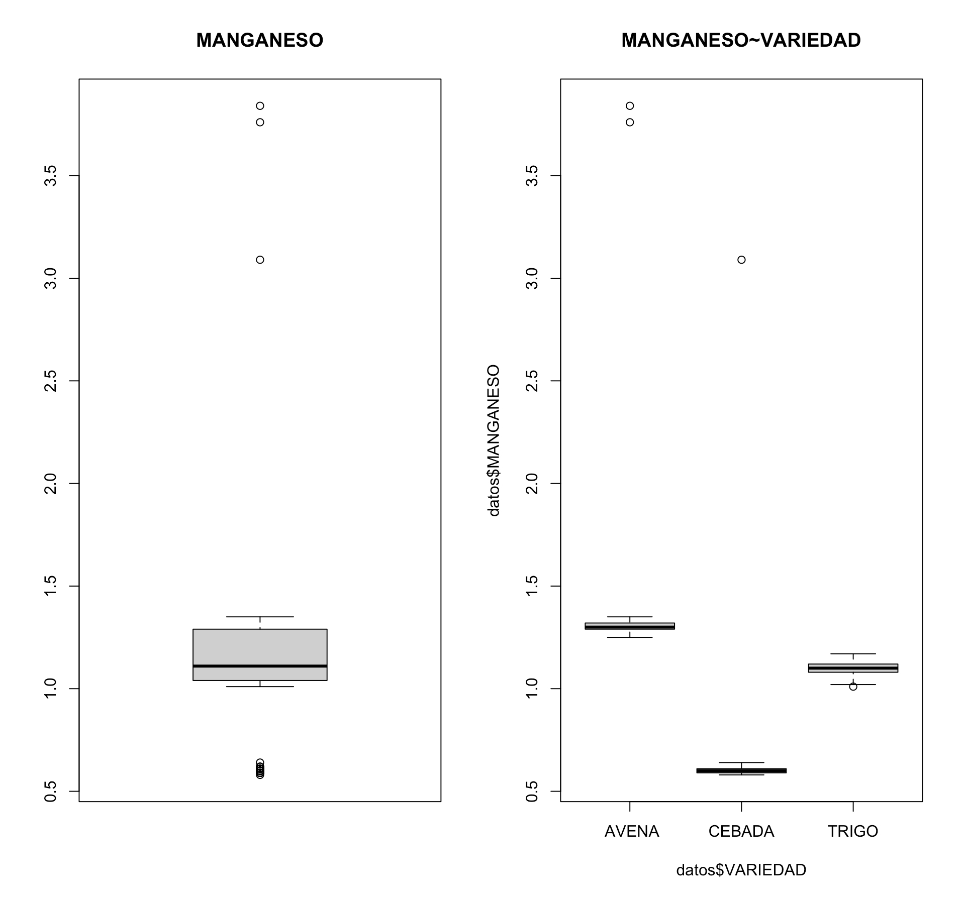 Los outliers que aparecían en el boxplot univariado, resulta que perteneces al cereal cebada que parece que tiene bajo contenido en manganeso. Lo que estamos viendo aquí en la variable MANGANESO no son datos atípicos sino una asociación estadística. Lo que si parece datos atípicos son los 3 que se van por arriba y esto además parece que son extremos, por tanto podríamos usar la definición de dato extremo para quitarlo: