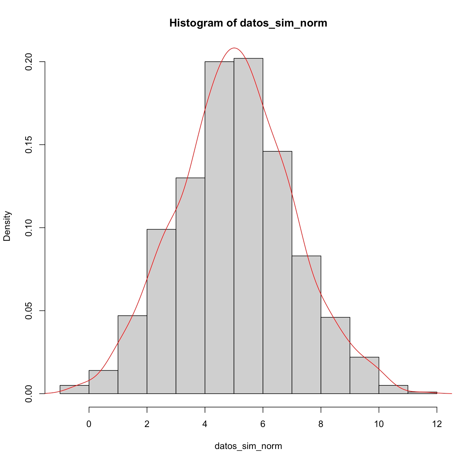 Un histograma es una representación gráfica de la distribución de los datos. Si los datos siguen una distribución normal, el histograma debería tener una forma de campana . Puedes superponer la densidad teórica de la distribución cuya media y varianza son las de la muestra.