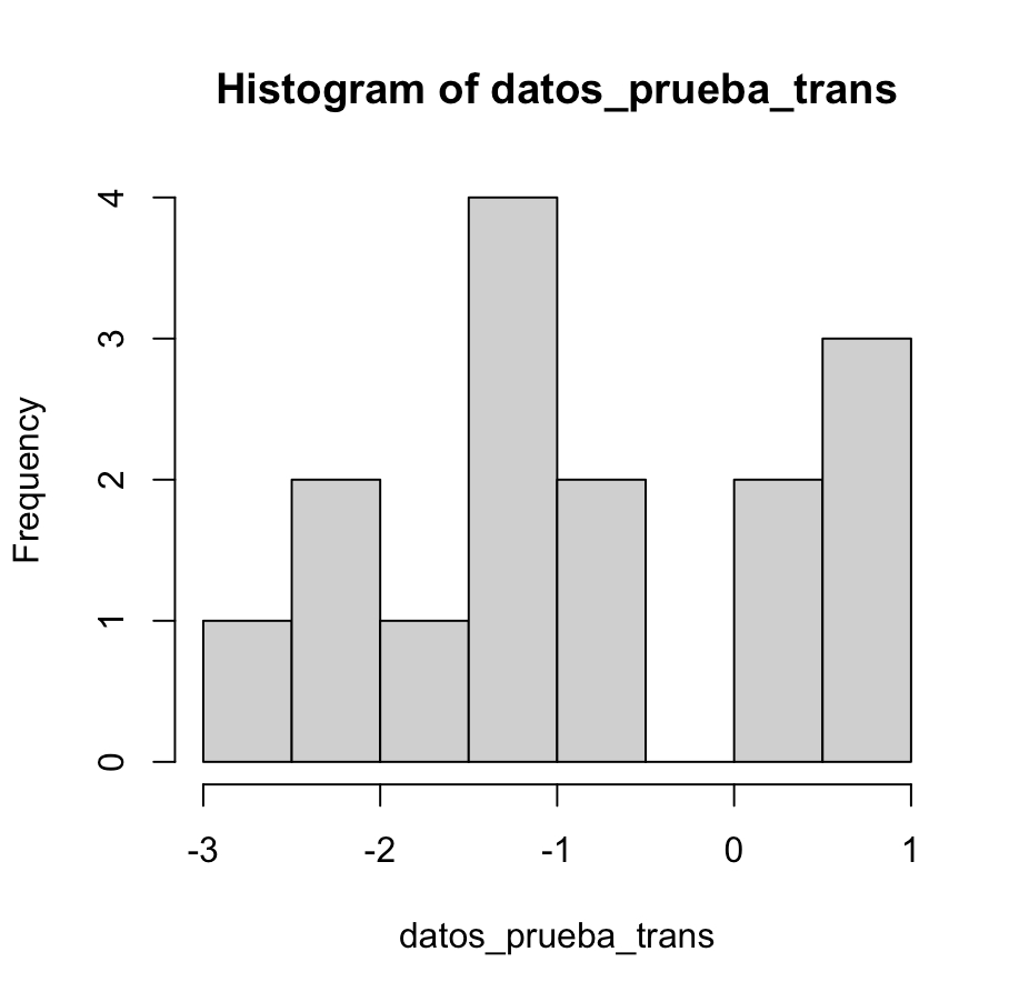 Como el gráfico anterior muestra que el 0 está dentro del intervalo de confiaza del λ óptimo y la estimación está realmente cerca del 0, en este ejemplo la mejor opción es aplicar la transformación logarítmica a los datos (ver tabla de la primera sección).