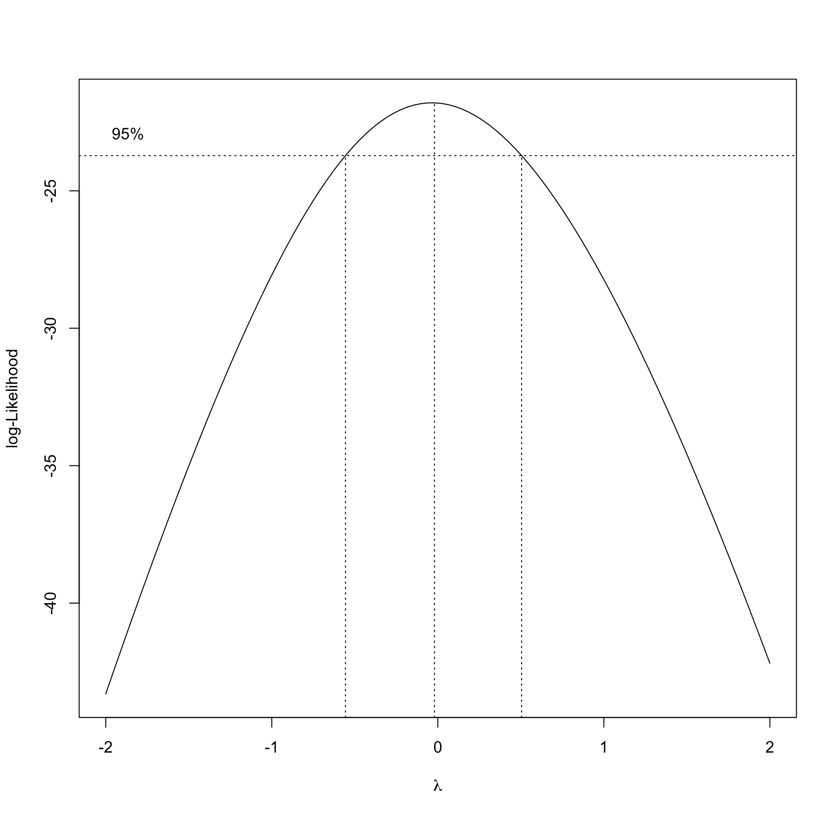 Usando R, podemos hacer uso de la función boxcox() de la librería MASS para estimar el parámetro de transformación por estimación de máxima verosimilitud.